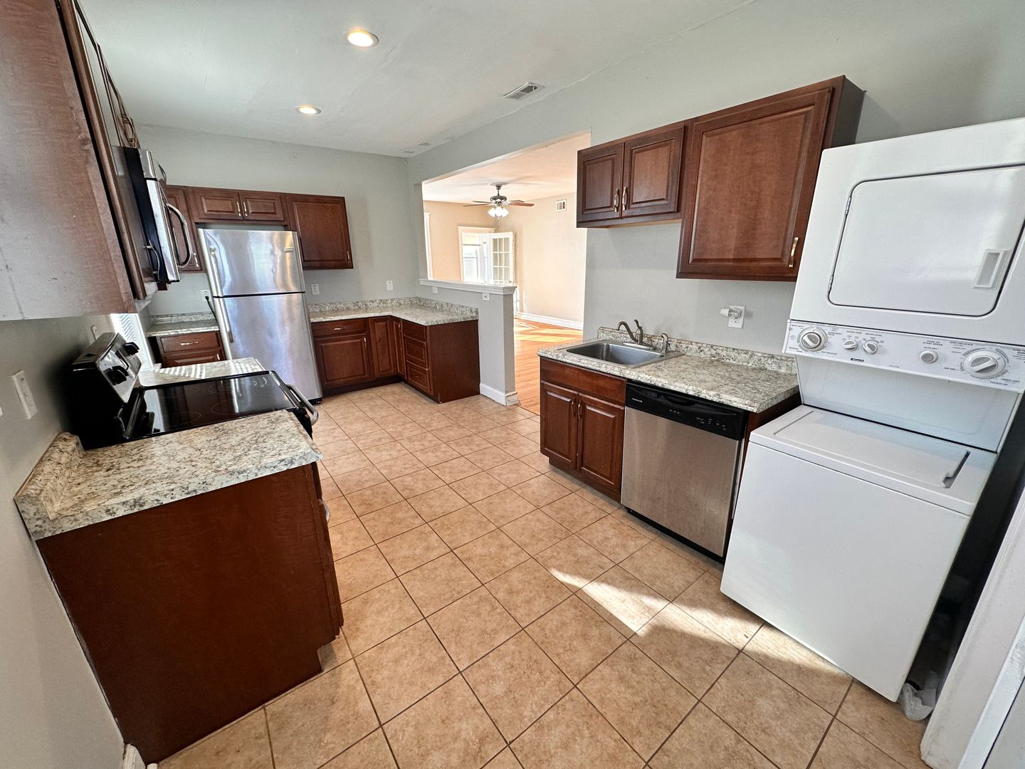 Apartment Features: The large living room is perfect for relaxing or entertaining, and the adjoining sunroom, filled with natural light, provides a cozy retreat. The fully equipped kitchen features stainless steel appliances, including a dishwasher, microwave, refrigerator, and stove - ideal for both everyday meals and gourmet cooking. A stackable washer and dryer in the unit make laundry day a breeze. When your day is done, off-street parking makes coming home easy.