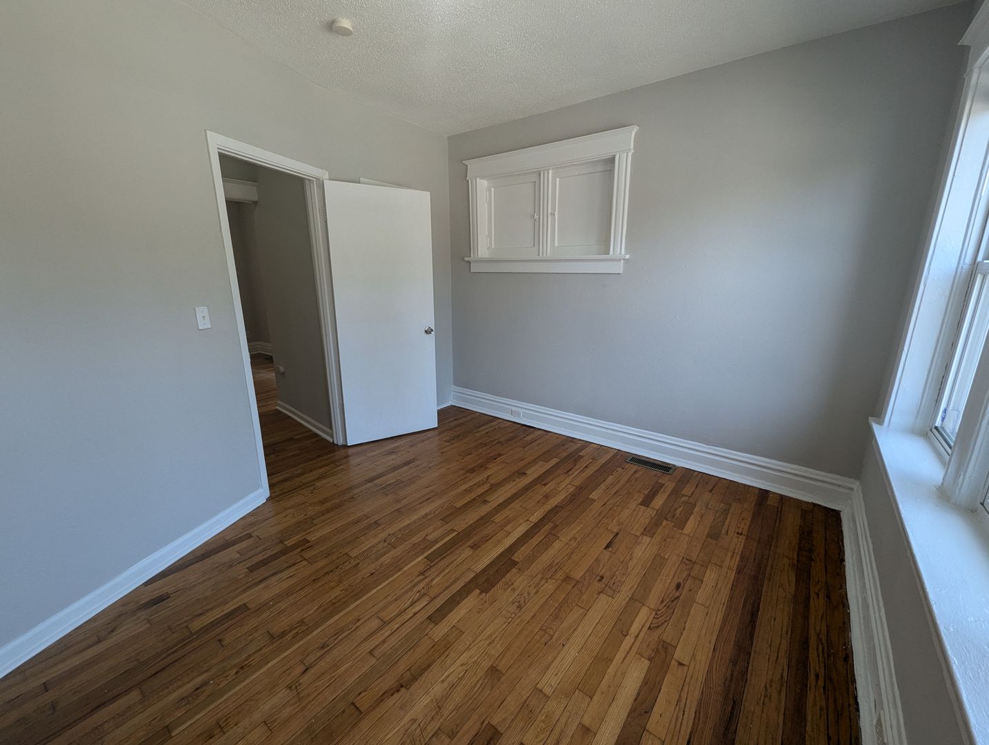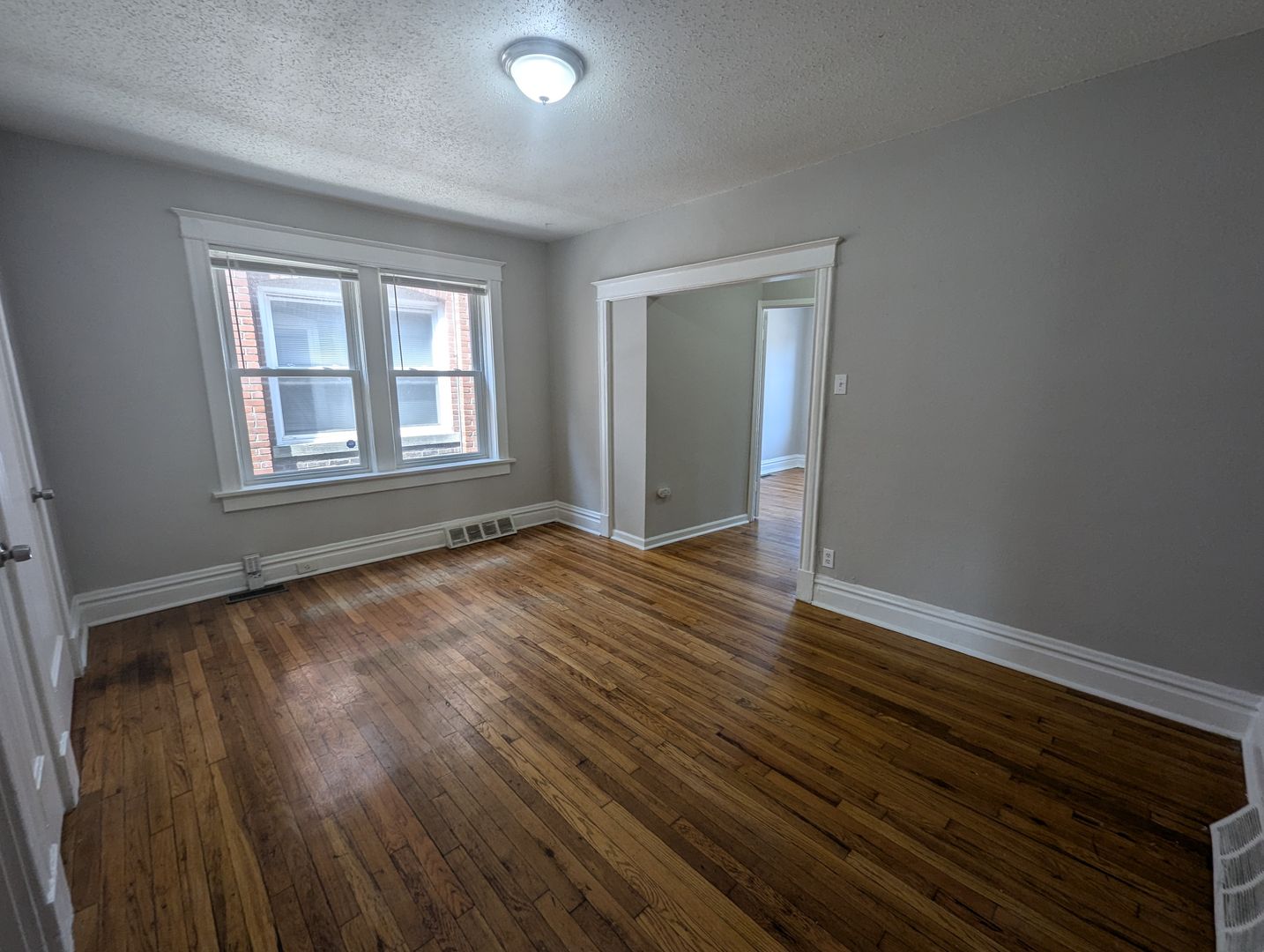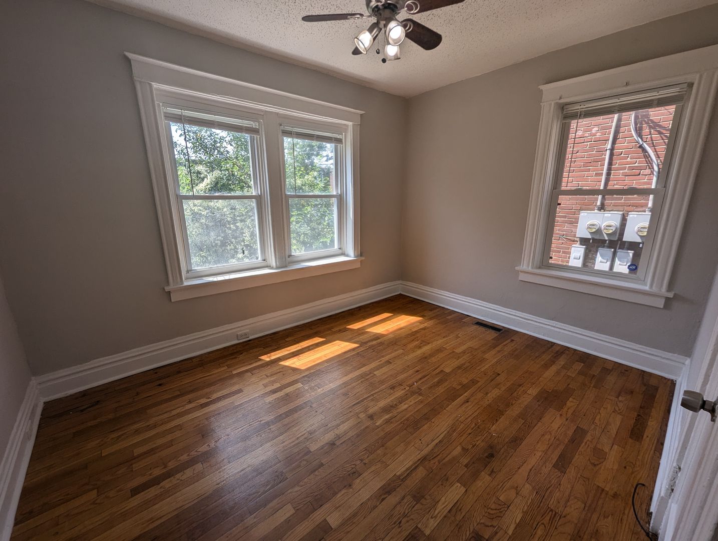 Step inside to a practical entry area with room for bags, coats, and the rest of life’s daily carry-ins. The front bedroom catches steady natural light and works equally well as a workspace or guest room. The living room anchors the layout with hardwood floors and reliable central heating and cooling that keeps the whole place comfortable in every season.