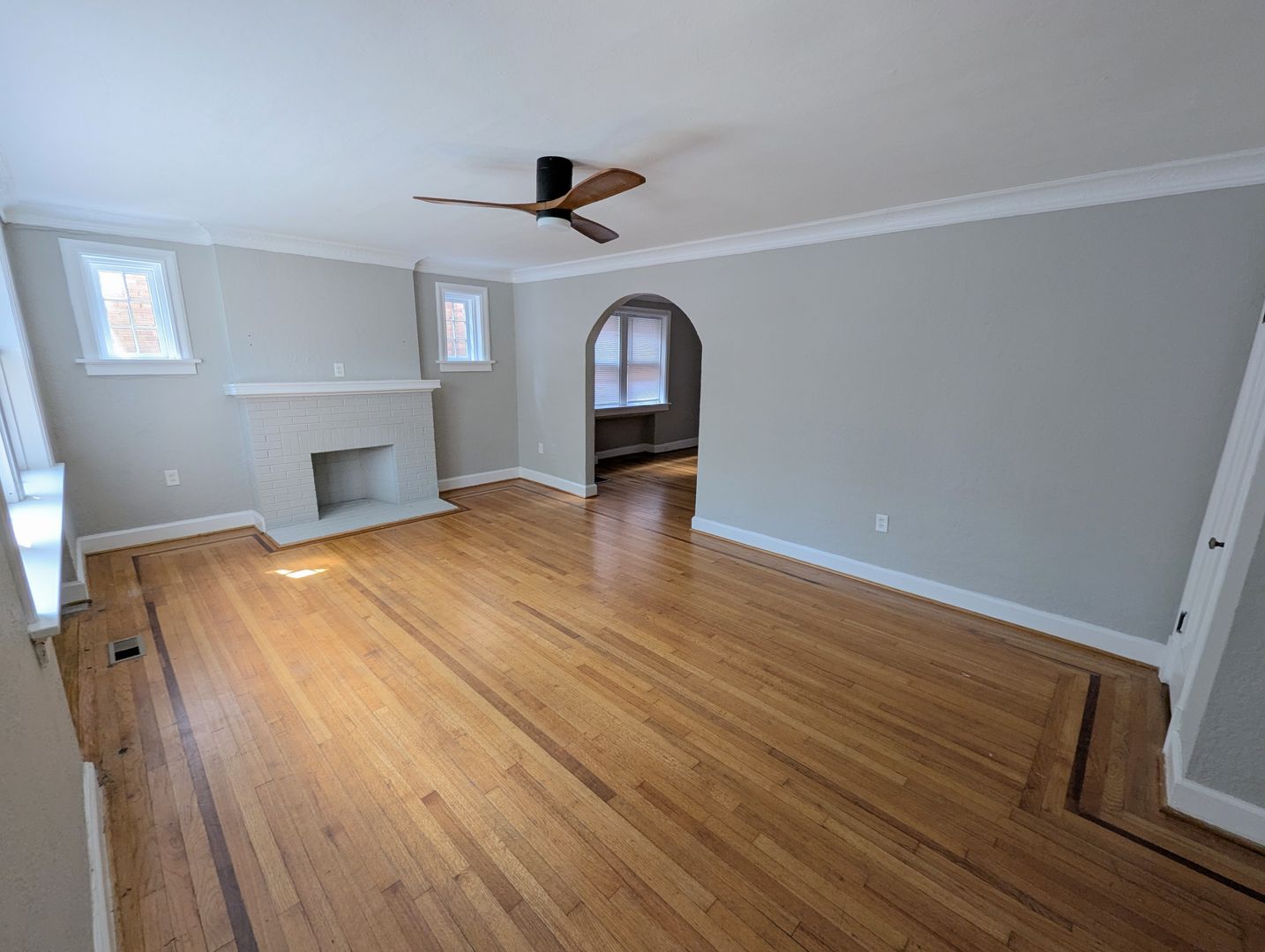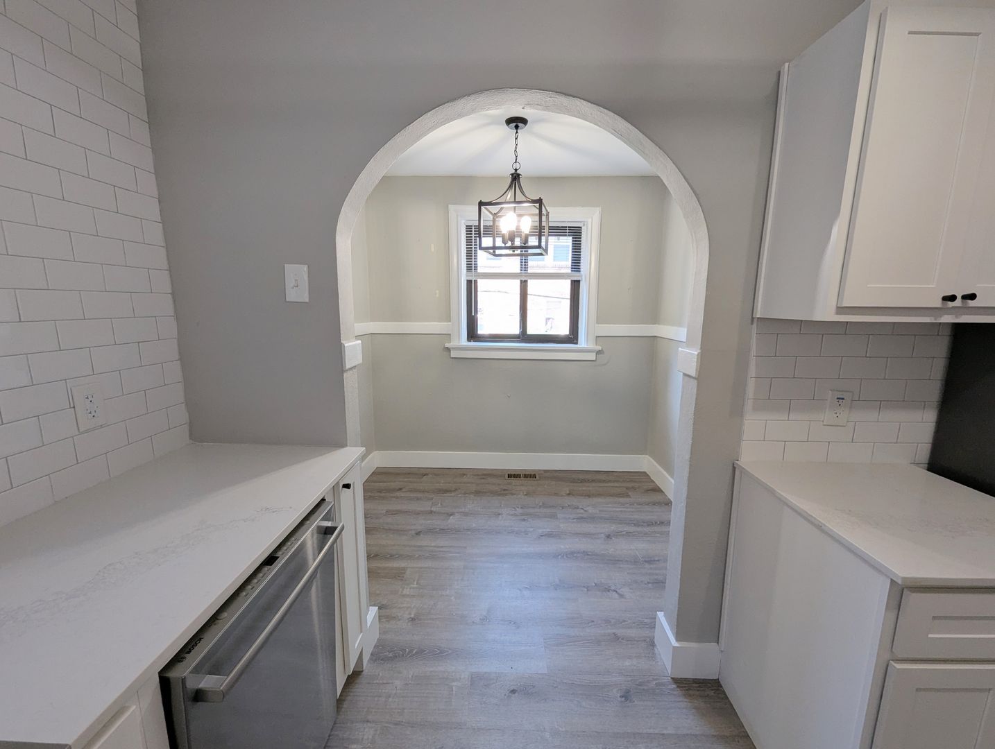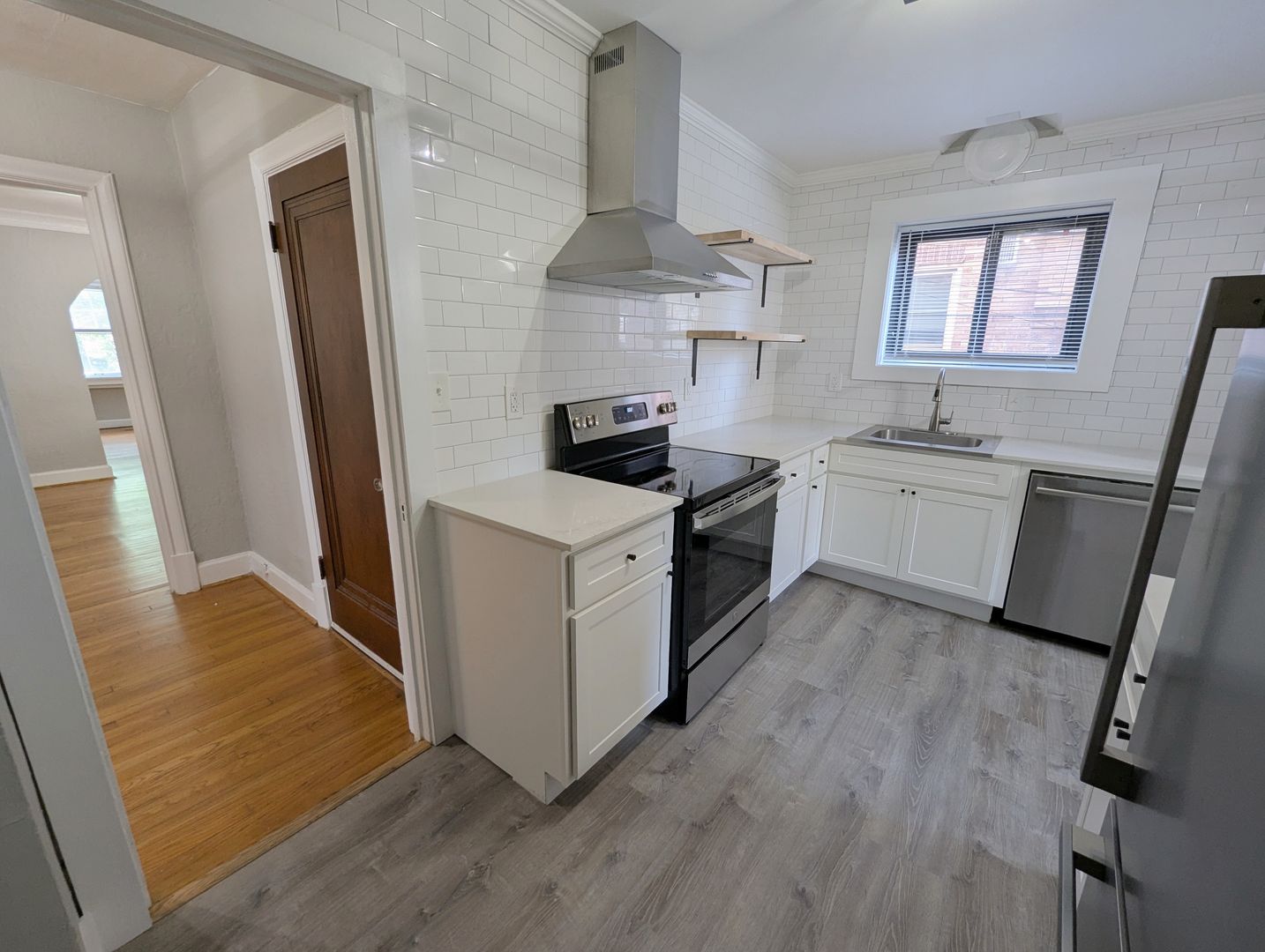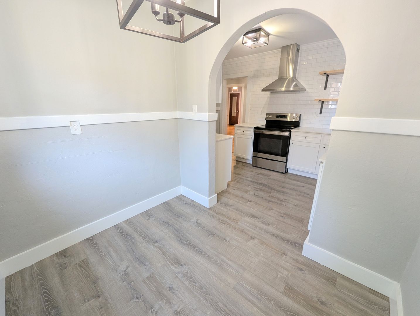 Inside you’ll find arched doorways, crystal doorknobs, and a decommissioned fireplace with big ‘hot tea and a good book’ energy. The kitchen features stainless steel appliances, open shelving, and an adorable nook that’s begging to become the designated plant zone / coffee station / snack headquarters.