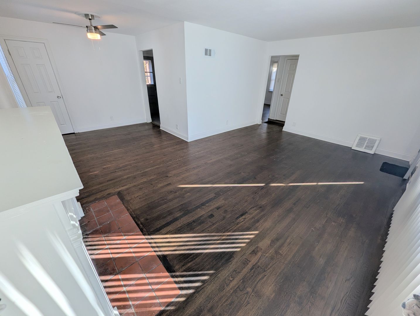 A decorative fireplace anchors the cozy living room, and the refinished hardwood floors and fresh paint breathe new life into every corner. Thoughtful updates and stylish fixtures blend seamlessly with the home’s original charm.