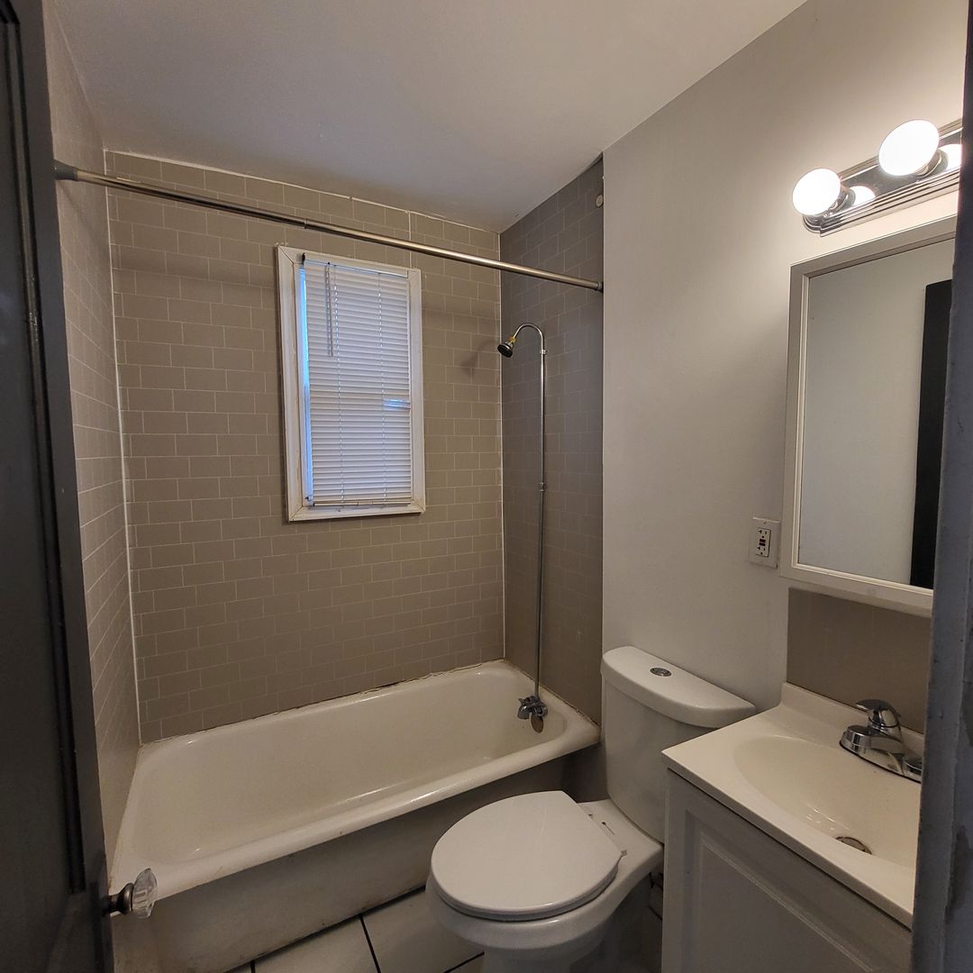 Inside, the apartment feels warm and welcoming. A decorative fireplace anchors the living space, hinting at the building’s character and giving the room a cozy, timeless feel. The flow continues into a thoughtfully updated bathroom—fresh, clean, and ready for slow mornings or quick get-out-the-door routines.