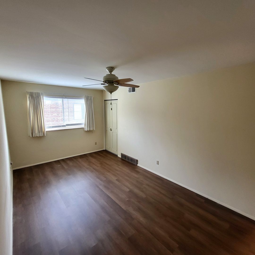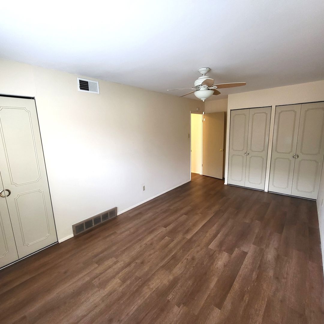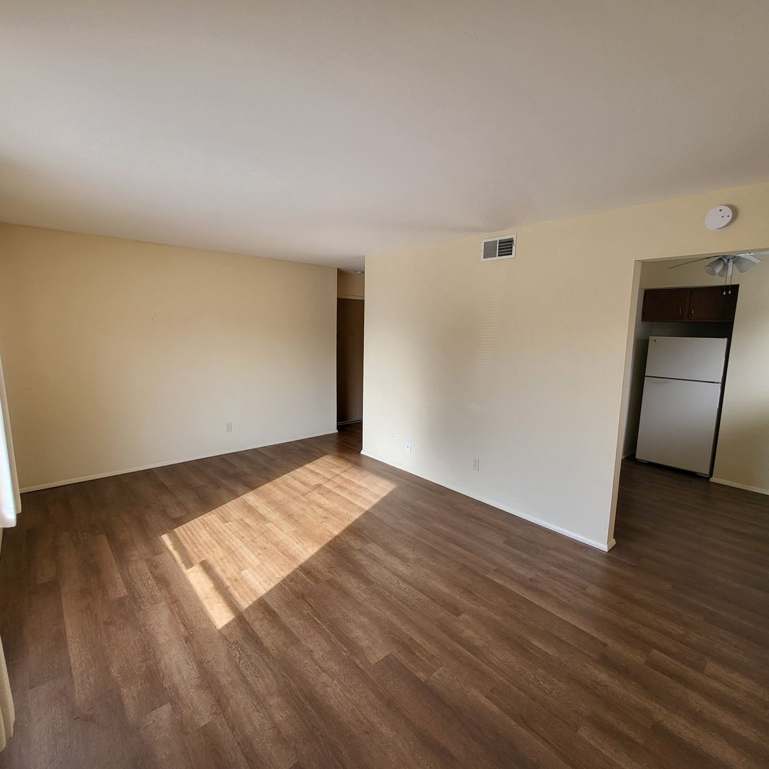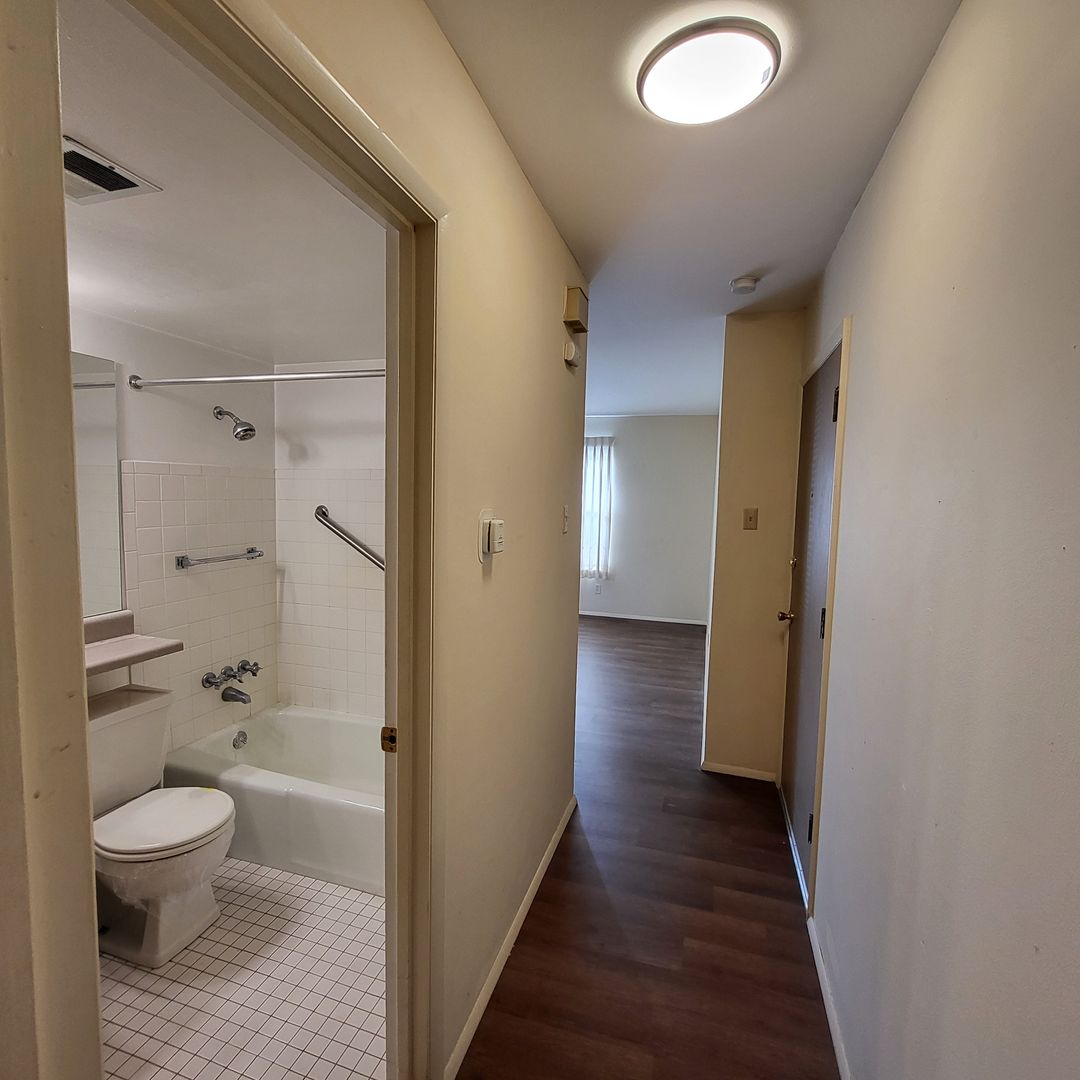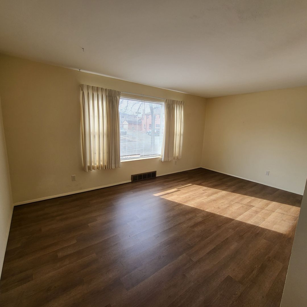 The living room features large windows that fill the apartment with natural light, creating an airy and cheerful atmosphere. Updated wood-look vinyl flooring runs throughout the unit, excluding the bathroom, giving the home a fresh, modern look. Curtain rods are already installed, making move-in simple, and the apartment offers generous storage space to help keep everything organized. Central heating and air conditioning ensure year-round comfort.